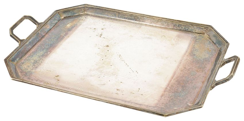 A Harrods, Art Deco-style silver plated twin handled trayof rectangular canted form with flared rim and two end handles, Harrods London S.W., H LD, A1, 3146 marks to base, 58.5 x 37.7 cmCondition: Good, tarnished, scratches to surface front and back