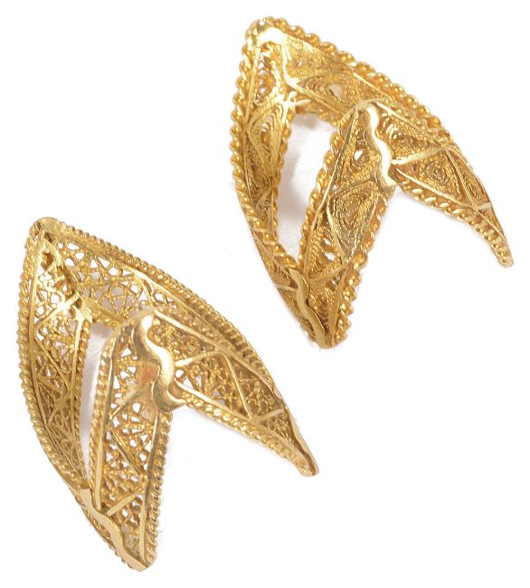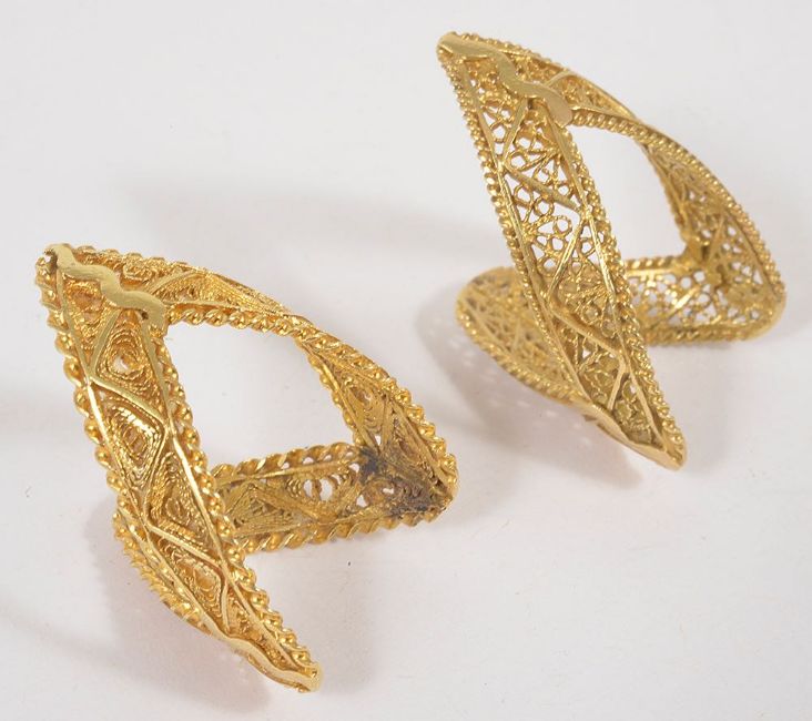 Two similar Eastern yellow metal filigree work wishbone ringsthe delicate filigree wire work within rope twist borders, whilst not a pair, very similar in size and design, both test for high carat gold (2)total weight approx. 9.3 gm. Approx. size N/OCondition: