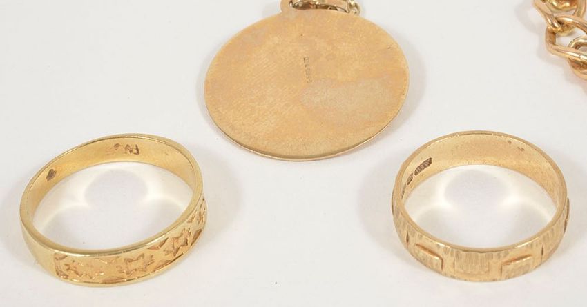 A small collection of contemporary 9ct gold fancy neck chains and ringsto include a rose coloured 9ct gold neck chain, a yellow 9ct gold neck chain, a 9ct gold St Christopher pendant on chain, a 9ct gold textured wedding band and another ring, tests for gold (5) approx. total weight 44.2 gm.Condition: Wear to all items chains have some links missing or detached