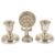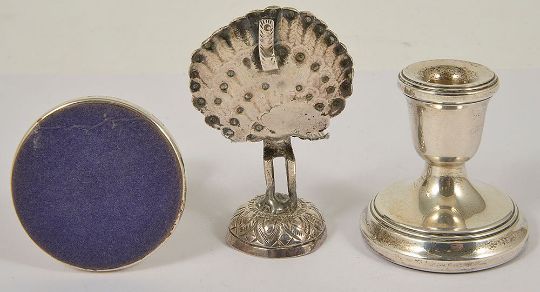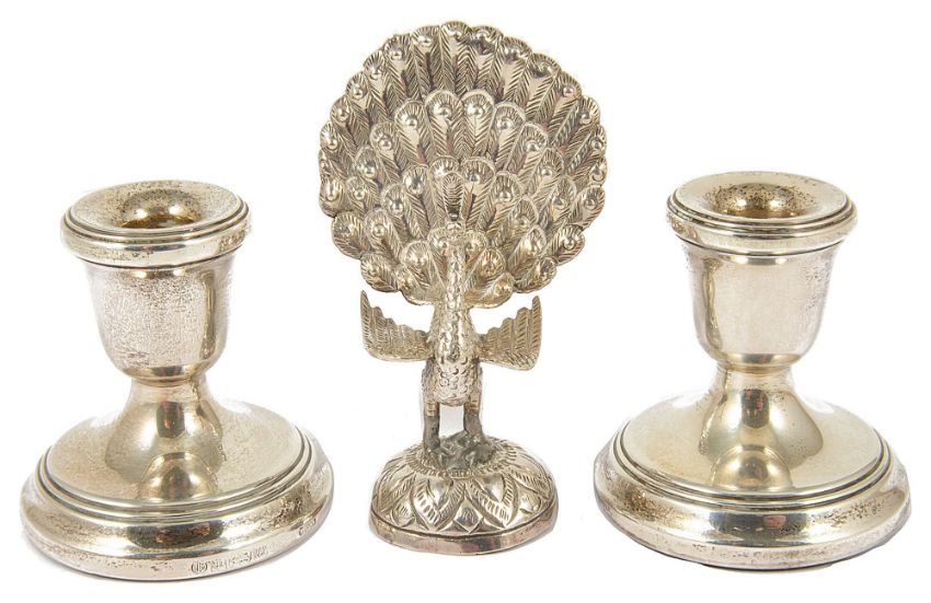 A pair of silver miniature squat taper candlesticks, Birmingham 1996 & 1997of squat form with filled circular bases, by LJ Millington and a white metal place card holder in the form of a standing peacock, no marks, (3)total weight: 2.5 ozt approx.Condition: Candlesticks are good, marks slightly worn. peacock is split at the feathers on the right hand side, no marks and not tested for silver.