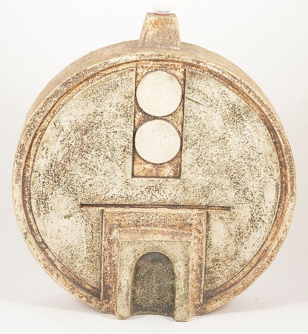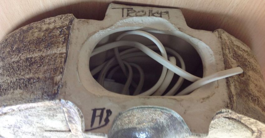 A Troika pottery wheel lamp base by Alison Brigden, 20th centurydecorated with geometric designs to both sides in cream, brown and pale green colouring, marked Troika and AB to baseheight: 44 cm total, 36 cm base, width: 33.5 cm, depth: 10 cmCondition: Condition is good with minor dirt, no apparent chips or cracks at time of cataloguing, not tested for electricity