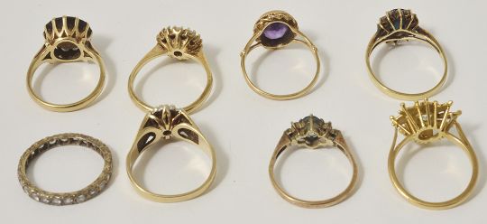 A collection of gold mounted contemporary dress ringsto include an amethyst and opal circular cluster, large smoky quartz ring, oval amethyst ring, three other 9ct gold mounted rings, a foliate design yellow metal ring, tests for gold and an eternity ring (8)respectively size P/Q, N, P, total weight of items approx. 27.4 gm.Condition: Eternity ring worn,