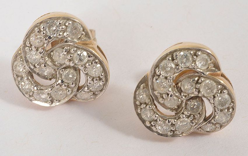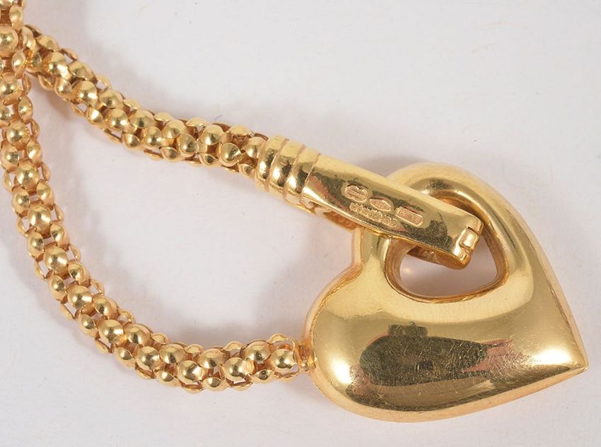 A contemporary gold heart motif necklace together with a pair of diamond earringsthe necklace of woven mesh and heart motif to front forming the fastening, together with a pair of 9ct gold mounted pave diamond set earrings of Turkish knot design (2)necklace approx. weight 11.5 gm. earrings approx. 3.1 gm.Condition: Overall good for both items