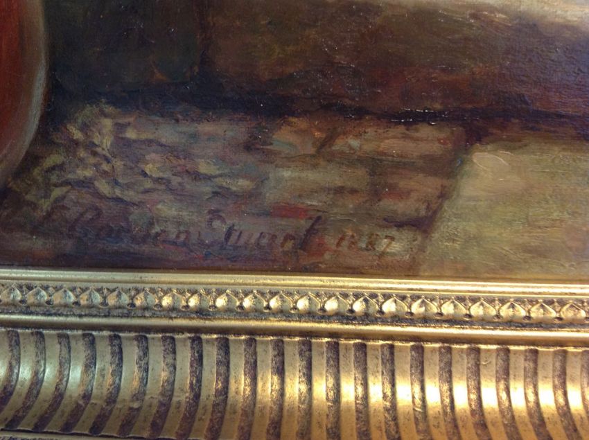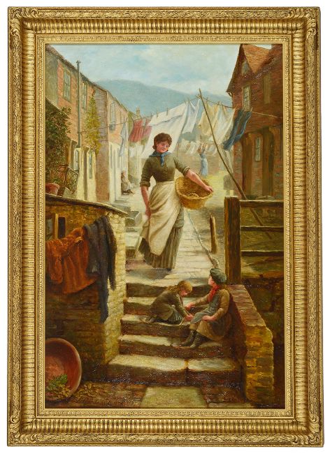 C.E Gordon Stuart (British active 1882 - 1896)'Hanging out the washing', a street scene depicting a woman holding an empty washing basket looking at two children playing on stone steps, with the washing drying in the breeze in the background, oil on canvas, signed lower left CE Gordon Stuart and dated 1887, mounted in a gilt frametotal frame: 90 x 64.5 cm, canvas: 76 x 50.3 cmCondition: Frame in good condition, canvas has been restored, paper edging to canvas seen from reverse, crackling to oil