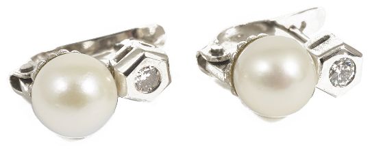 A pair of cultured pearl and diamond set earringswith single stone diamond in hexagonal white metal collet mount and with cultured pearl below, (unmarked but tests gold)weight 6.9 gmsCondition: Overall good