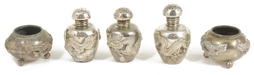 A collection of Chinese export silver cruets, early 20th centurycomprising three small matching pepperettes and similar twin salts, each decorated in high relief with the dragon chasing the flaming pearl, impressed character marks to base, (5)weight: 3 ozt approx., height: pepperettes - 5 cm, salt - 3 cm diameter of salt: 4.5 cmCondition: Fair, with minor wear throughout