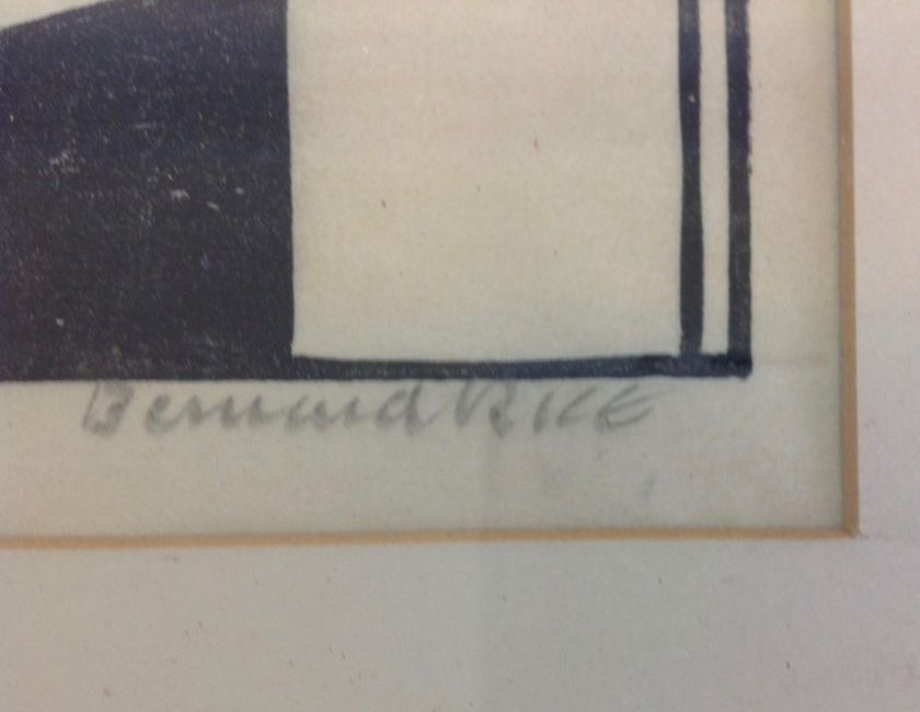 Bernard Rice (Austrian 1900-1998) Six woodblock portrait caricatures from Bernard Rice's Bosnia period in the 1920's, three mounted in each black frame, each signed in pencil, together with an abstract oil on canvas laid on board, signed to reverse of frame A Goss Molly Rice, (3) woodblock frames: 56.7 cm 27.2 cm, abstract frame: 58.5 x 51.5 cm Condition: Fair, with foxing and staining to etchings, frames slightly damaged at corners