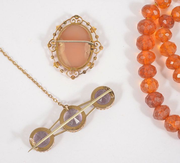 A large Victorian three stone amethyst bar broochmount tests for gold, a classical carved shell portrait cameo in 9ct gold floral scroll brooch mount, together with a short facetted amber bead necklace (3)largest amethyst measures approx. 12 mm. diameter, approx. weight 7 gm, cameo approx. length 3.5 cm. amber beads approx. weight 19.9 gm.Condition: Facets to reverse of central amethyst have short but quite deep scratches, some chipping to reversed of amethyst closest to hinge, several test patches to reverse of mount, some rubbing to cameo surface, beads would benefit from cleaning and restringing