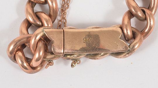 An Edwardian 9ct rose gold hollow curb link braceletof large link form, having 'invisible' push clasp fastening, stamped 9ct to the reverseApprox. weight 24.5 gm.Condition: Even overall wear commensurate with age but overall in good order, some tarnish to links, would benefit from a clean