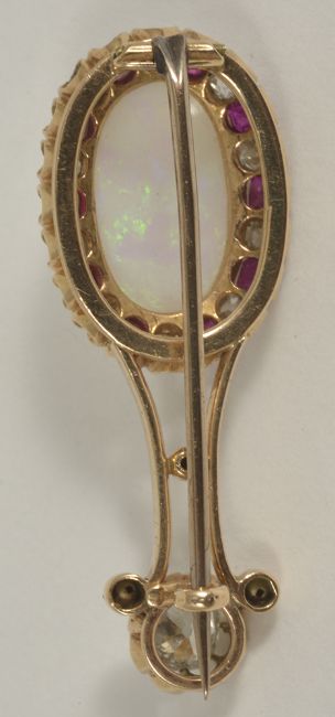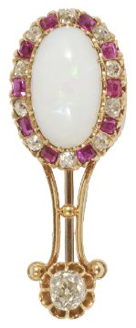 A Victorian precious opal, ruby and diamond set broochhaving large oval opal set within a ruby and diamond cluster joined by narrow scrolls to a single claw mounted old cut diamond, yellow metal mount, tests for goldmeasures approx. 4 x 1.5 cm., opal measures approx. 15 x 9 mm, approx. weight 5.3 gm., single stone spreads approx. 0.25 ctCondition: Overall good