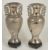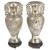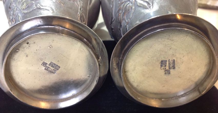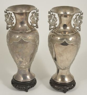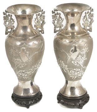 A pair of twin handled Chinese export silver vases, circa 1910the baluster bodies decorated in high relief with a perched bird amongst blossoms, the reverse with empty cartouche, the pierced handles formed as opposing birds on prunus branches, impressed character marks to bases, with associated pierced carved hardwood stands, (4)height: 23 cm, weight: 20 ozt approx.Condition: Both vases with wear, one vase has dents in the body, however crisp details, the other with pin dent to reverse, the base pushed in slightly, dent to rim