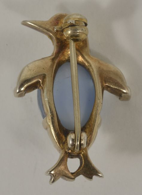 An amusing silver gilt and paste set penguin brooch, circa 1950having faux moonstone 'jelly belly', paste set flippers, head and body and with bright green eye, unmarked, tests for silver giltapprox. 23 mmCondition: Overall good, all pastes present at time of cataloguing, original fastening pin