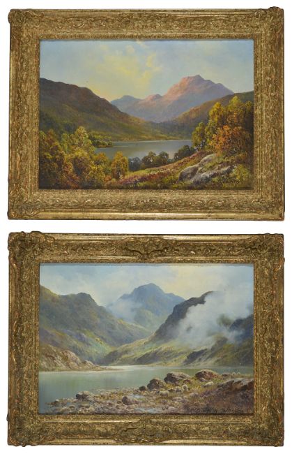 Douglas Falconer (British 1913 - 2004) Loch Tay depicting sheep grazing beside a loch surrounded by mountains, signed Douglas Falconer lower left in black, oil on board, framed, written inscription on reverse of board 'Loch Tay Perthshire Scotland by Douglas Falconer' Loch Sunart, depicting a loch surrounded by autumnal mountains and trees, signed Douglas Falconer lower left in black, oil on board, framed, written inscription on reverse of board 'Loch Sunart North Scotland by Douglas Falconer', (2) loch tay total frame: 34 x 44.2 cm, board: 25.5 x 35.5 cm; loch sunart total frame: 34.1 x 44.5 cm, board: 25.4 x 35.7 cm Condition: Fair to good, with wear to both frames, marking around the edge of the board on Loch Tay example, possibly from an earlier frame