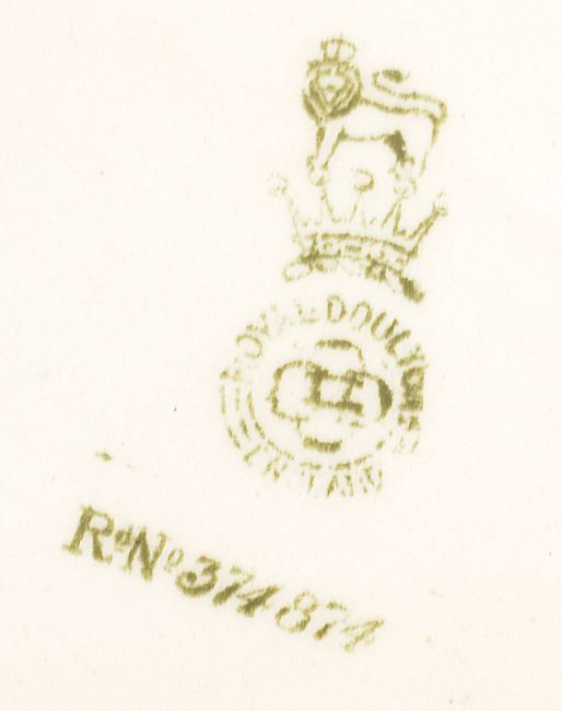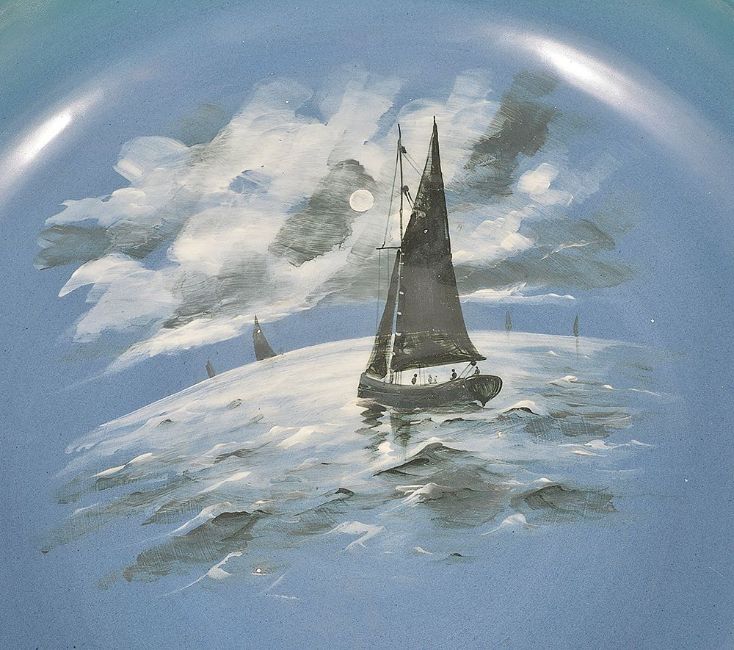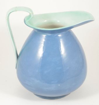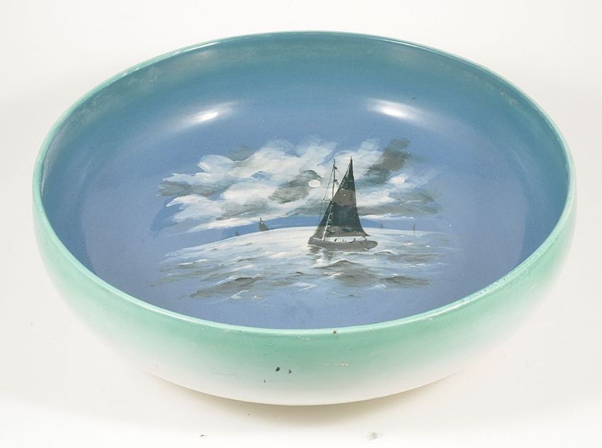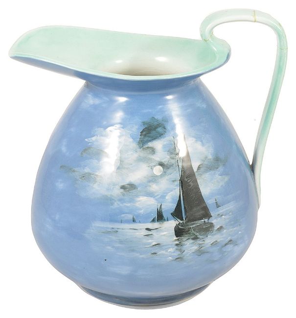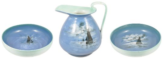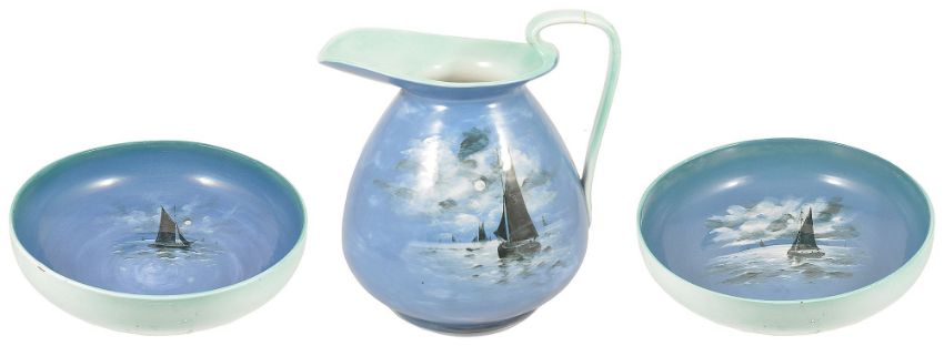 A Royal Doulton porcelain suite with yachting scenes,comprising two large wash bowls, each with painted yachts at sea on a blue ground interior and the exterior in a green to white body and a water jug of similar decoration, each with the green Royal Doulton mark to the bases and Rg No. 374874, a/f, (3)height of jug: 16 cm, height of bowl:11.5 cm, diameter of bowl: 36 cmCondition: Condition is good for the two bowls, with obvious wear to each, wear and scratches to the painted interior, body of jug is crazed and the handle has been repaired, signs of old glue marks, minor scratches to body.