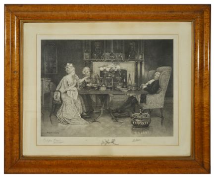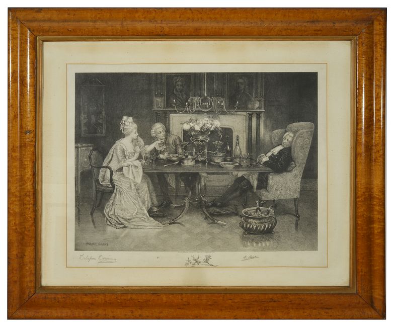 Delapoer Downing (1853 - 1926)'Dinner Party' etching of a couple dining with their host asleep, printed and pencil signature Delapoer Downing, published by CC Clifford Haymarket, mounted in a birds eye maple cushioned frametotal frame: 78 x 66.5 cmCondition: Fair, with damage to frame, chips and veneer splitting, foxing and dirt on mount