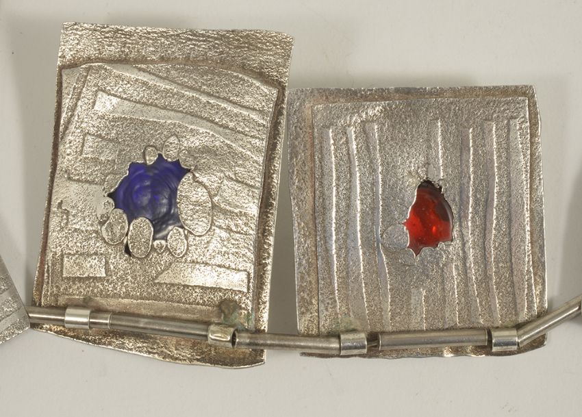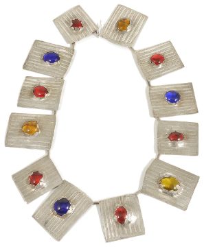 A large modernist design silvered necklace, circa 1980'sformed of twelve textured panels each with central coloured glass cabochon, no markingslength: 59.5 cmCondition: Good, with minor wear