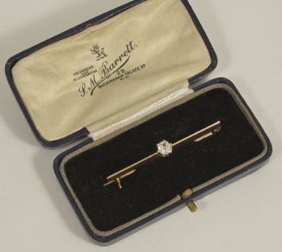 An early 20th century old cut diamond set bar broochthe single diamond mounted on a yellow metal narrow bar brooch, tests for gold, associated boxdiamond approx. 0.25ct, approx. weight of item 2.8 gm.Condition: