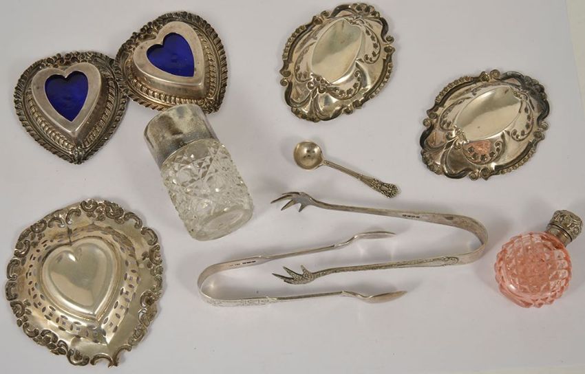 A good small collection of assorted silvercomprising a pair of Edwardian silver heart shaped salts with original blue liners and one spoon, two miniature silver bon bon dishes, a pin tray in the form of a heart, two pairs of nips and two glass and silver miniature dressing table bottles, (10)overall weight 7 ozt approx., length of salts 6 cmCondition: Minor dents and wear but not major damage. The glass in good condition.