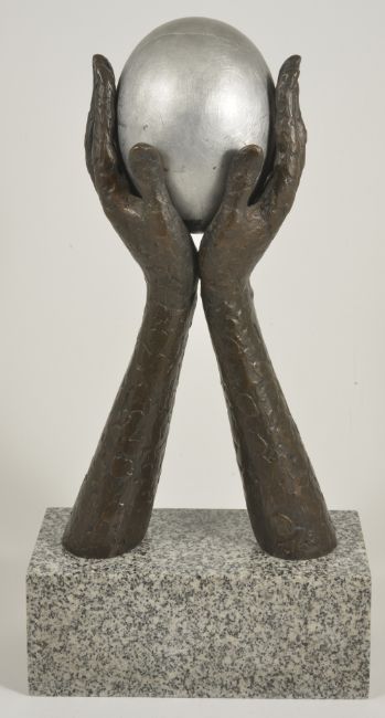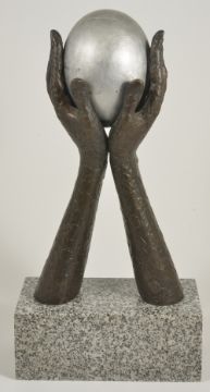 Marino Amaya (Spanish 1928 - 2014) 'El Derecho A La Vida' (The Right to Life), patinated bronze arms and hands holding an removable aluminium egg, opening to reveal a removable bronze baby, bears signature M Amaya, upon a rectangular granite base, together with a 'El Derecho A La Vida catalogue with Marino Amaya autographed letterheads and three further Marino Amaya booklets, (5) height: 46 cm, width: 23.3 cm, depth: 12 cm, Condition: Good, with minor wear to granite base, minor scratches to egg, wear to catalogue and booklets Marino Amaya was born in Astorga, Leon in 1928, he received his first commission as a sculptor at the age of 15 years when he sculpted a statue of the Apostle Santiago in white stone. Acclaimed to have sculpted over four thousand works in his lifetime.