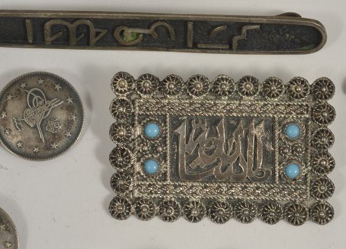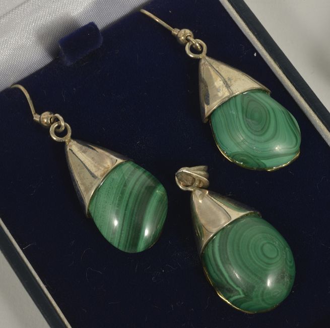 A collection of Chinese and Eastern silver jewelleryto include cufflinks, tie pins, brooches, a silver and marquisette European elephant brooch, a modernist silver mounted malachite pendant and matching earrings and more....(Q)Condition: Overall good, items would benefit from a clean