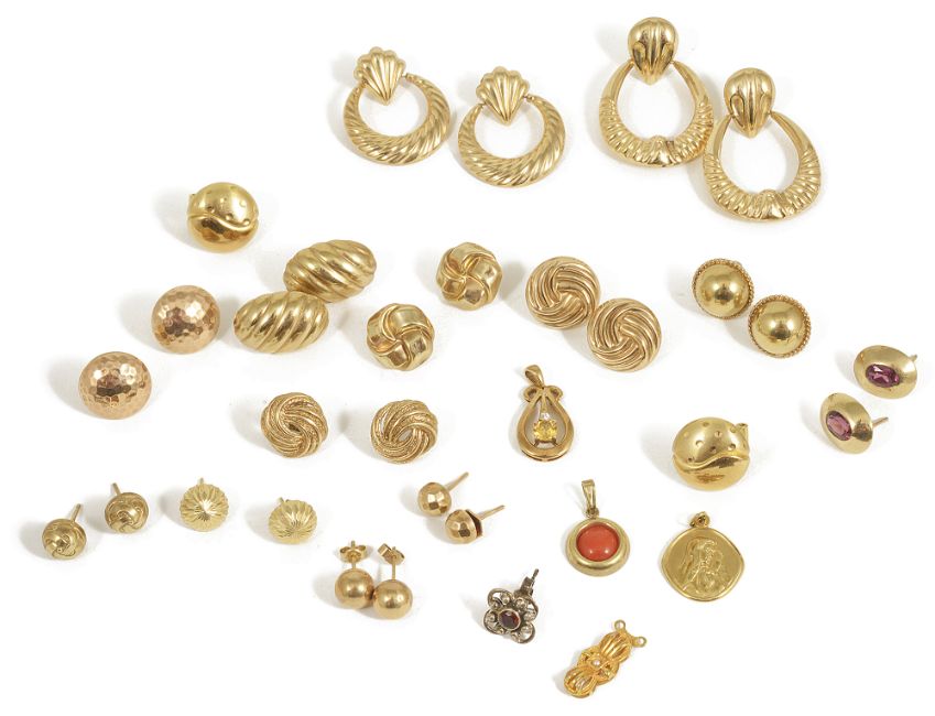 A large collection of contemporary 9ct gold pairs of earrings includinghoops and button earrings, most with engraved and bright cut decoration, the majority marked for gold, if not then test for gold, together with a small 9ct gold push clasp (Q)approx. weight 34.4 gmCondition: Overall good, earrings retaining crisp detail