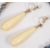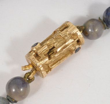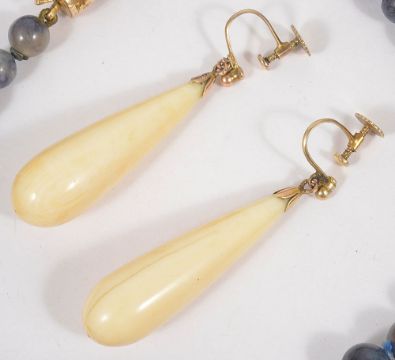 A pair of Edwardian gold and ivory pendant drop earringsthe polished ivory tapered drops suspended from rose coloured 9ct gold screw fittings, together with a graduated lapis lazuli grey/blue graduated bead necklace with yellow metal and sapphire set barrel clasp, test for gold (2) Drops approx. 4.5 cm., necklace approx. 70 cm.Condition: Overall good for both items, some light yellowing to ivory grain and a hairline running the length of one drop
