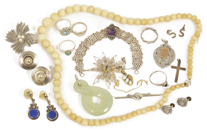 A small collection of various silver and other jewelleryto include a Mexican silver earrings, silver gate bracelet, marquisette and silver jewellery, two Mexican silver and hard stone bead necklaces a green hard stone pendant and various other items, (Q)Condition: Overall good for lot, one stone absent from cluster ring, one bar brooch