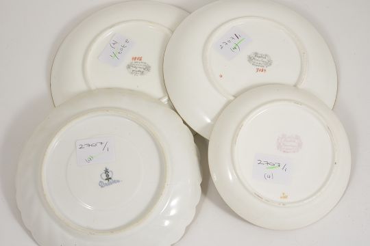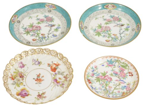 A pair of Minton porcelain saucers and a Dresden porcelain saucer,the pair of Minton saucers with turquoise border with four cartouches, surrounding a central prunus blossom scene with a bird, each bears marks to reverse, another Minton porcelain saucer with overall colourful prunus blossoms, bears marks to reverse and a Dresden porcelain saucer, with scalloped edge gilt scrolled border surrounding a central flower head painted body, painted marks to reverse, a/f, (4)diameter: pair of minton: 16.3 cm, single minton: 12.5 cm, dresden: 16.2 cmCondition: Fair, with wear throughout each, chips to rims of one of the pair, minor scratches to surfaces of all