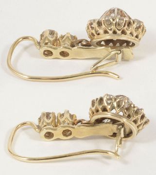 A pair of diamond set daisy cluster drop earrings, circa 1940having raised spoke set central diamond within a circular cluster suspended from a twin diamond set yellow gold fitting, mounts test for gold, in associated fitted boxtotal drop approx. 22 mm., approx. diameter of cluster 1 cm., total weight approx. 4.1 gm., cluster centre stone approx. 0.05 ctCondition: Some wear to claw tips, stones are bright but not even sized, some edge chipping to several stones, fastening in good order