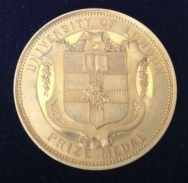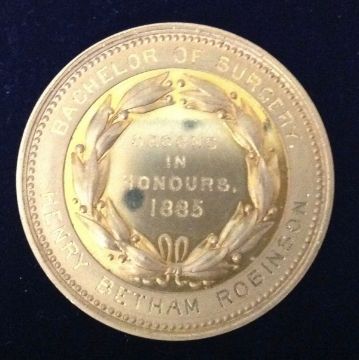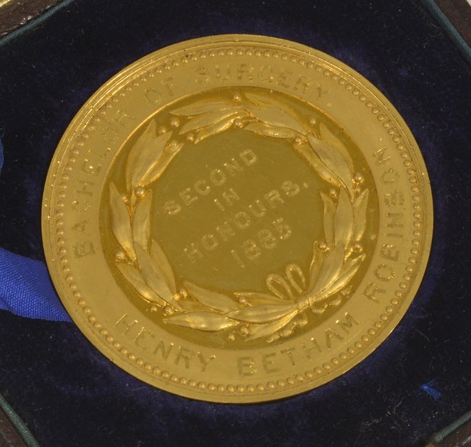 A 22ct gold University of London Bachelor of Surgery Prize Medal Presented to Henry Betham Robinson 1885the obverse with University of London coat of arms, the reverse with wreath enclosing Second in Honours 1885, in fitted navy velvet lined red morocco leather case 32 gm., 3.8cm diameter Condition: In very good clean overall condition with no obvious damage.From direct descent to the present owner.Henry Betham Robinson (1860-1918) graduated from University of London with a Bachelor of Medicine and Surgery, whilst there he won many distinctions including the scholarship and gold medal's for medicine and surgery offered here. He went on to become a Surgeon for Diseases of the Throat. He was also a lecturer in anatomy and surgery eventually becoming Senior Surgeon at Thomas's Hospital.