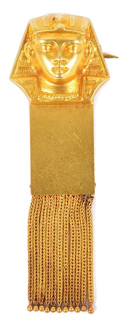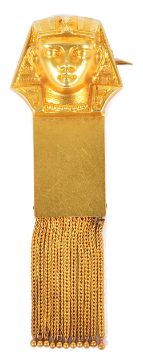 An Edwardian Egyptian Revival, gold 'Pharaoh Head' broochthe hollow brooch in high relief depicting an Egyptian bust on rectangular column with tassels below, yellow metal tests for goldmeasures approx. 53 x 19 mm, approx. weight 5.8 gm.Condition: Overall good and retains overall bloom, retains crisp detail, historical repair to the top left tassel edge, tassel tops do not lie totally flat
