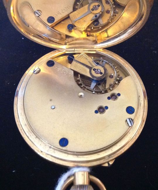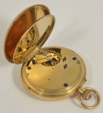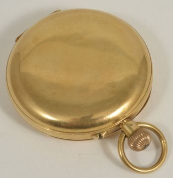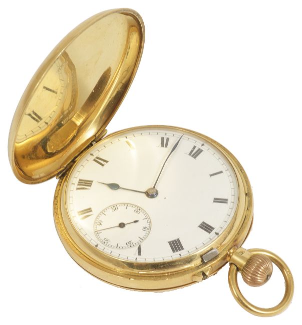 A 18ct gold full hunter pocket watch, Birmingham 1924the white enamel dial with roman numeral hours and baton minutes with spade hands and subsidiary seconds dial, case hallmarked 18 with crown and movement numbered 94589dial diameter: 42 mmCondition: Fair to good, hands are slightly warped, movement NOT working, minor scratches to outer case