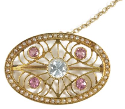 A delicate Edwardian 15ct. gold seed pearl and gem set scroll brooch,the oval brooch set with four small pink rubies and central aquamarine, each gem collet set and mounted on a fine scroll ground, marked 15ct to reverseapprox. 2.5 cm. across, approx. weight 3.6 gm.Condition: Overall good, one seed pearl absent