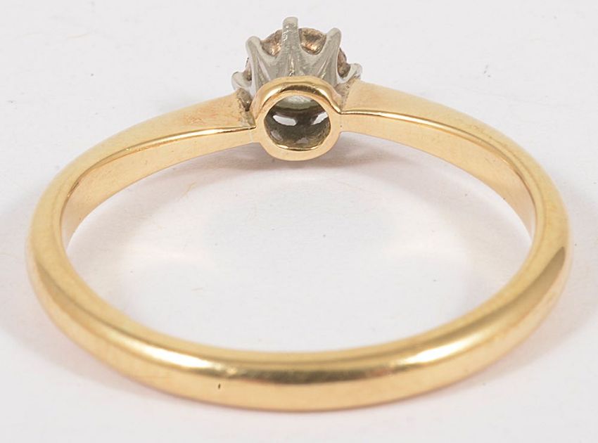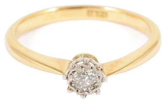 A delicate single stone diamond set ringin yellow and white 18ct gold fancy set mount, diamond approximately 0.15 ct.size NCondition: Overall good
