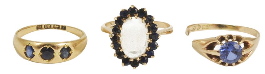 A Victorian three stone sapphire set gypsy ring, 18ct gold mount, a contemporary oval moonstone and sapphire set cluster ring, 9ct gold mount, together with a single stone 9ct gypsy ring a.f.three stone ring size P, cluster ring P/QCondition: Three stone gypsy ring side stone lighter, single stone ring af