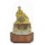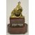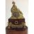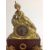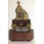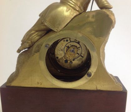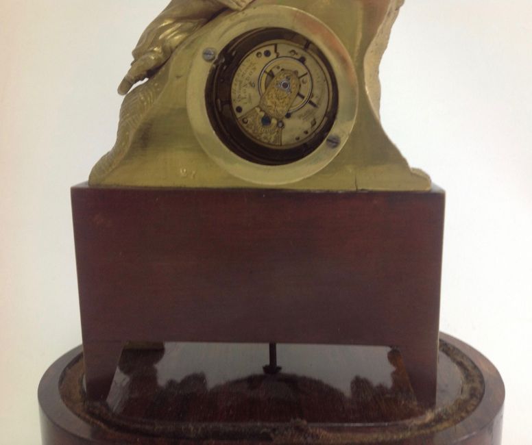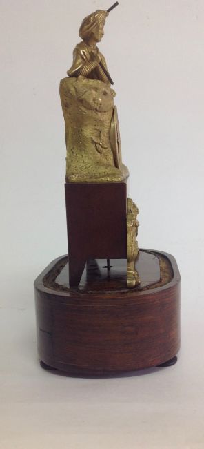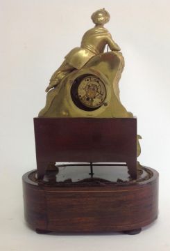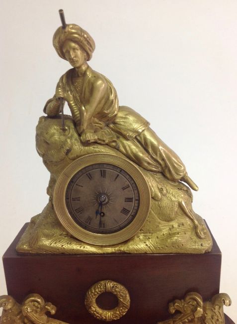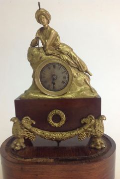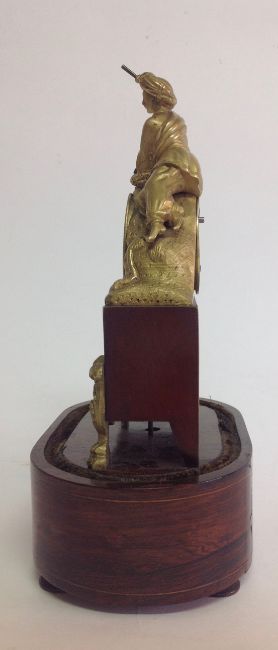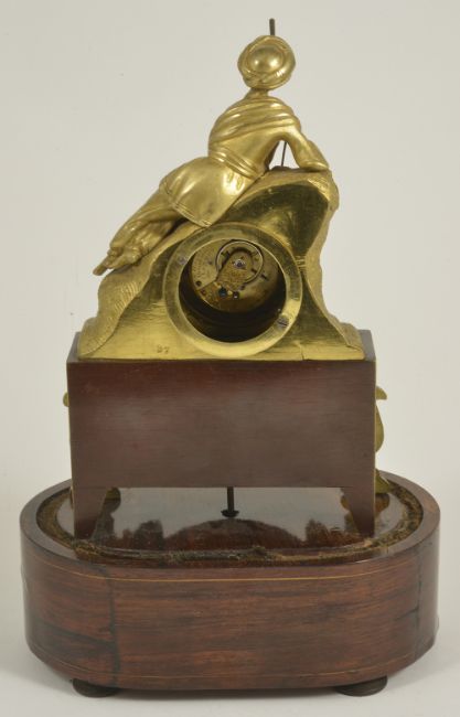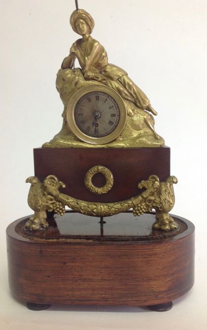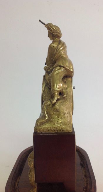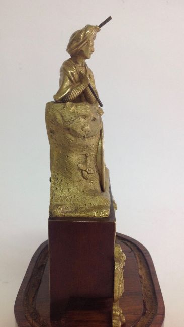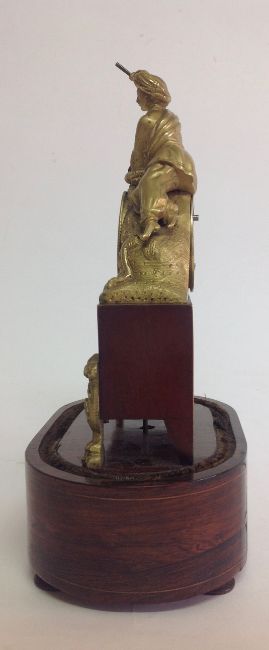 A decorative gilt metal and rosewood mantel clock, early 20th century modelled as a gentleman wearing a turban lying on a lion in gilt metal, above an inset silvered roman numeral dial with spade handles, upon a faux mahogany metal section mounted with gilt metal foliate wreath and swag, over a oval rosewood pad foot base, with glass dome, with watch key total height with dome: 30 cm, height: 27 cm Condition: Fair, with wear throughout, watch mechanism NOT tested