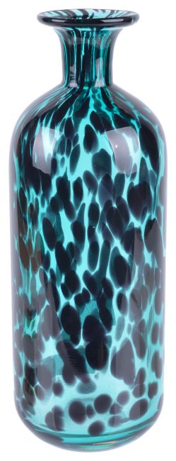 the turquoise glass with black speckled design, with flared rim
