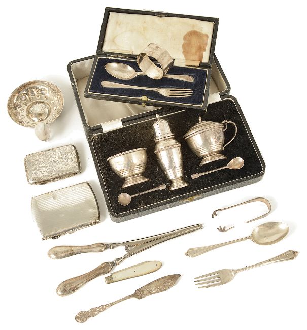 A collection of silver cruets, cigarette cases, christening spoons with forks,