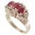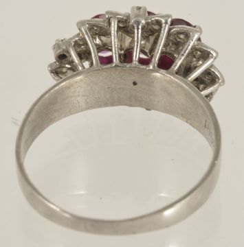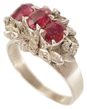 having three central oval rubies set within a foliate mount with diamond point detail, the white metal mount marked 18K and numbered 2291