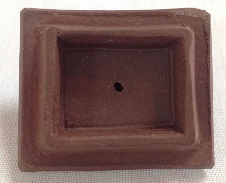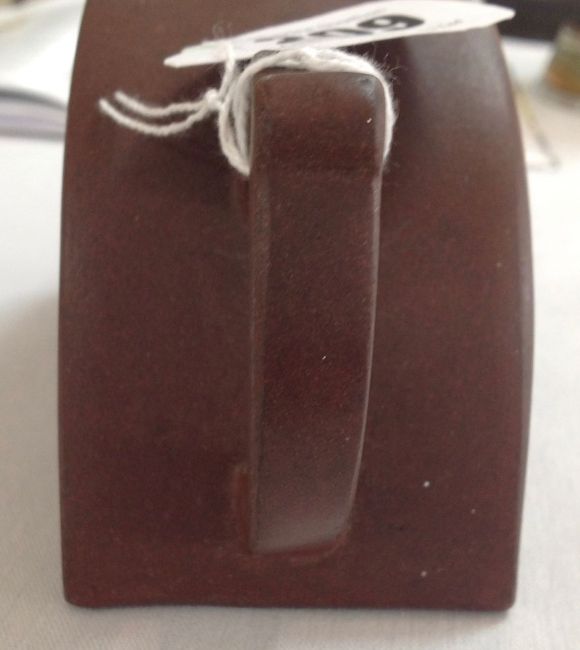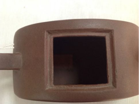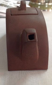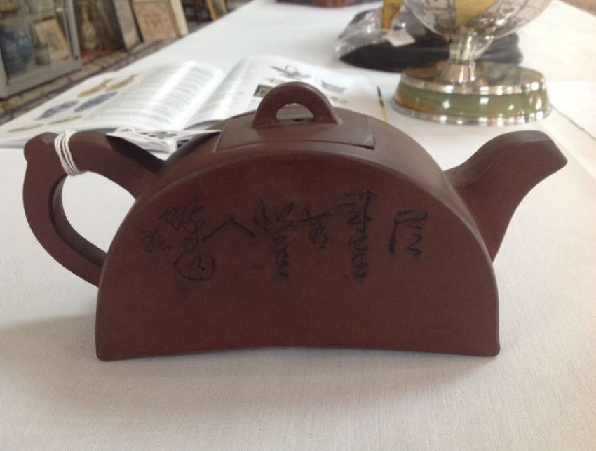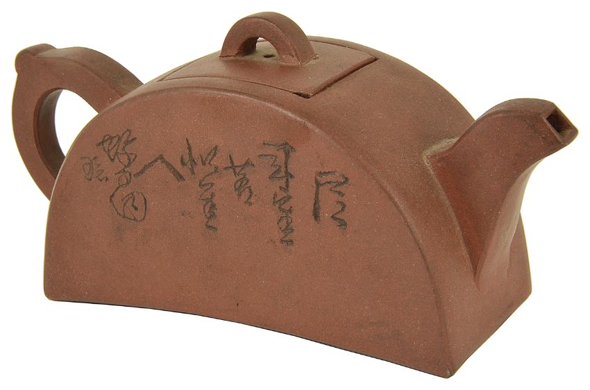 of domed squat form and with shaped lid, both front and back decorated with incised Chinese characters