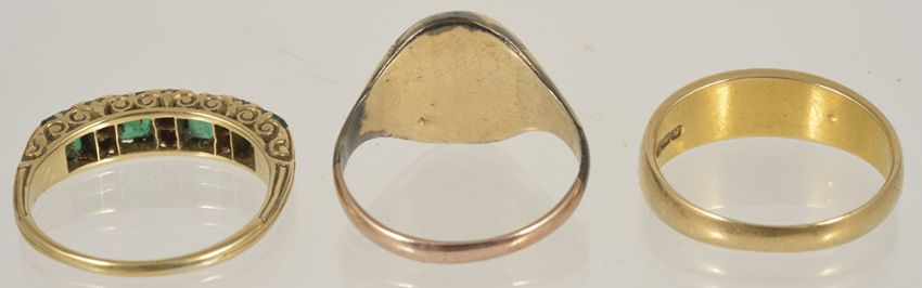 emerald ring size O, approx. weight 3.4 gms., pearl ring approx. weight 3.5 gms., signet ring approx. weight 2.9 gms.