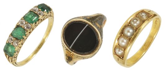 the rectangular shaped emeralds spaced with twin diamond points and in scroll engraved yellow metal mount, tests for gold, together with an 18ct gold half pearl set ring and a banded agate set signet ring, tests for gold each with associated Victorian leather ring box (3)