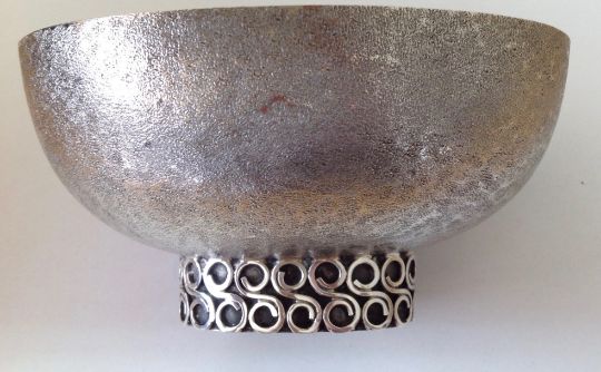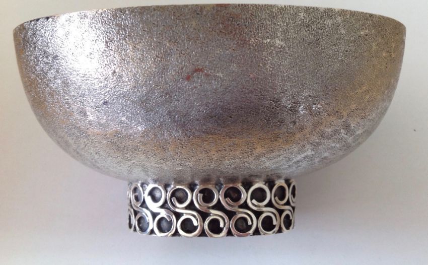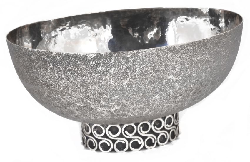 of oval form, with hammered decorated interior, the pitted decorated exterior upon oval foot ring with applied s scroll decoration, bears marks Wiener Silber Schmiede Handgeschlagen, hoopoe head 1 and 925
