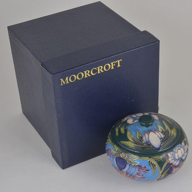 each tube lined squat jars with knopped covers, bearing painted and impressed marks to bases, one with painted signature Kerri, both with original boxes, (2)