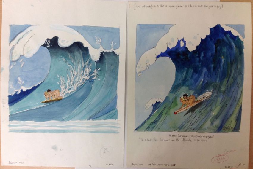 cartoon artwork for Playboy Sept. 1986 pg. 170, drawn: Oct. 1985, pen and ink with watercolour, on Daler board, signed lower right, caption below, artists notes lower margin, Smilby yellow dot verso, with dust cover sheet, together with two artist's paper rough workups for this artwork with the artists notes in the margins, one signed lower right and 'Ok Color ' on lower margin in crayon, (3)