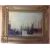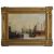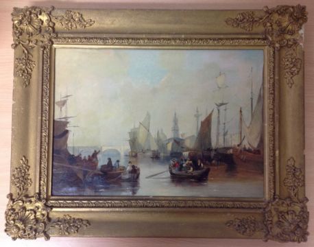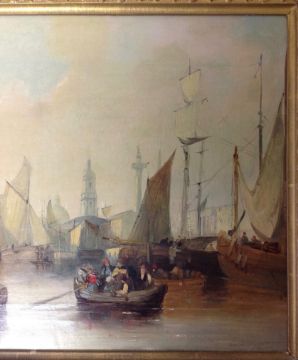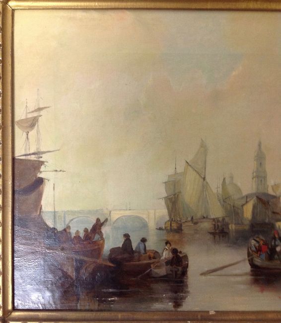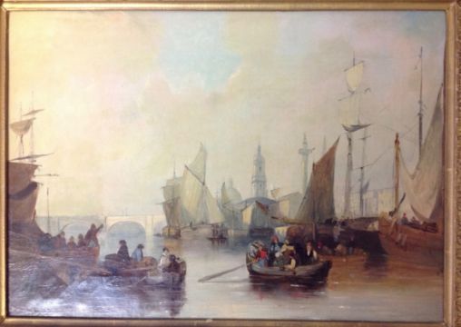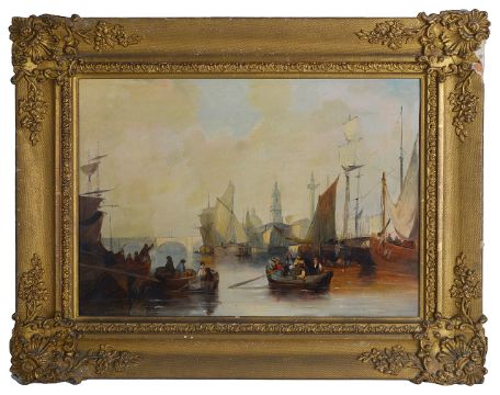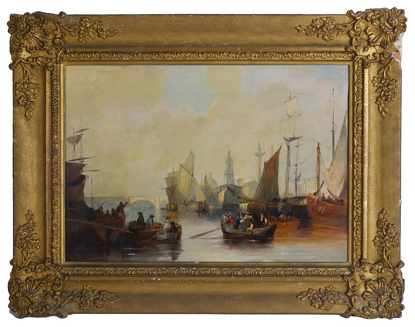 of boats moored to the river bank with sails being hoisted and a bridge and monuments in the background, oil on canvas, unsigned, in a gilt foliate frame