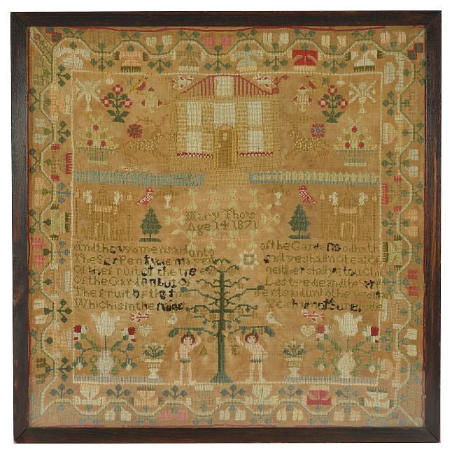 by Mary Tho's age 14 1871, worked in coloured threads, depicting Adam and Eve with architectural buildings, flora and fauna and poetry, in oak frame