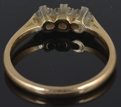 the centre stone approximately 0.20ct set between two slightly smaller diamonds, the mount marked for 22ct gold
