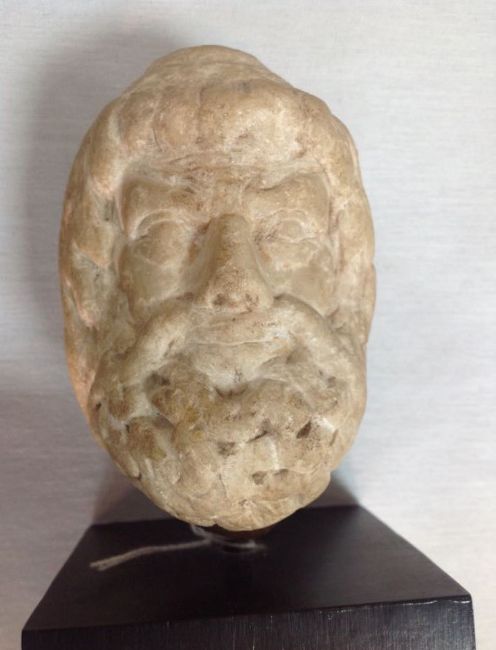 heavily bearded with raised eyebrows and central crown is shaven, raised upon a square section plinth