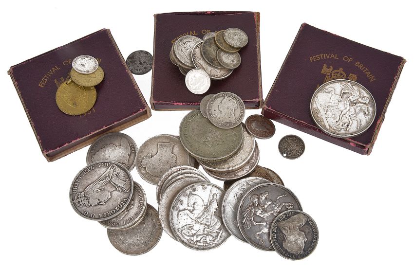 four Festival of Britain 1951 boxed five shillings; 19th and 20th century crowns, half crowns, one shilling, six pence, one florin, two shilling and further miscellaneous coinage, (qty)